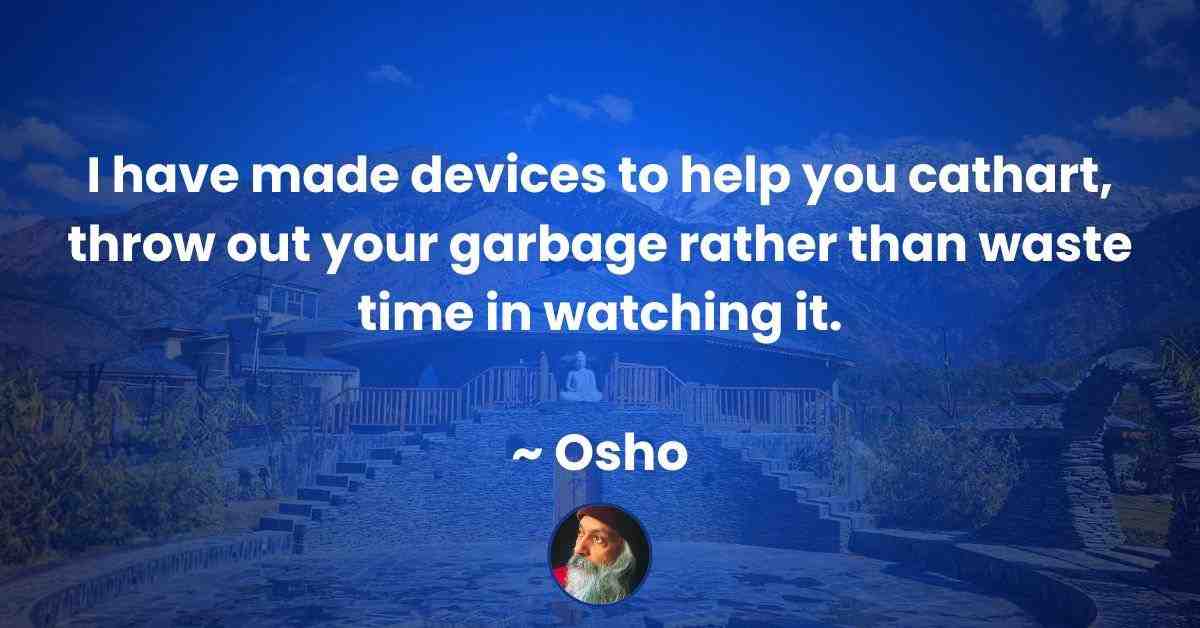 EXPLODE! … Let go of everything that needs to be thrown out. Follow your body. Give your body freedom to express whatever is there. Go totally mad. Scream, shout, cry, jump, kick, shake, dance, sing, laugh; throw yourself around. Hold nothing back; keep your whole body moving. A little acting often helps to get you started. Never allow your mind to interfere with what is happening. Consciously go mad. Be total.